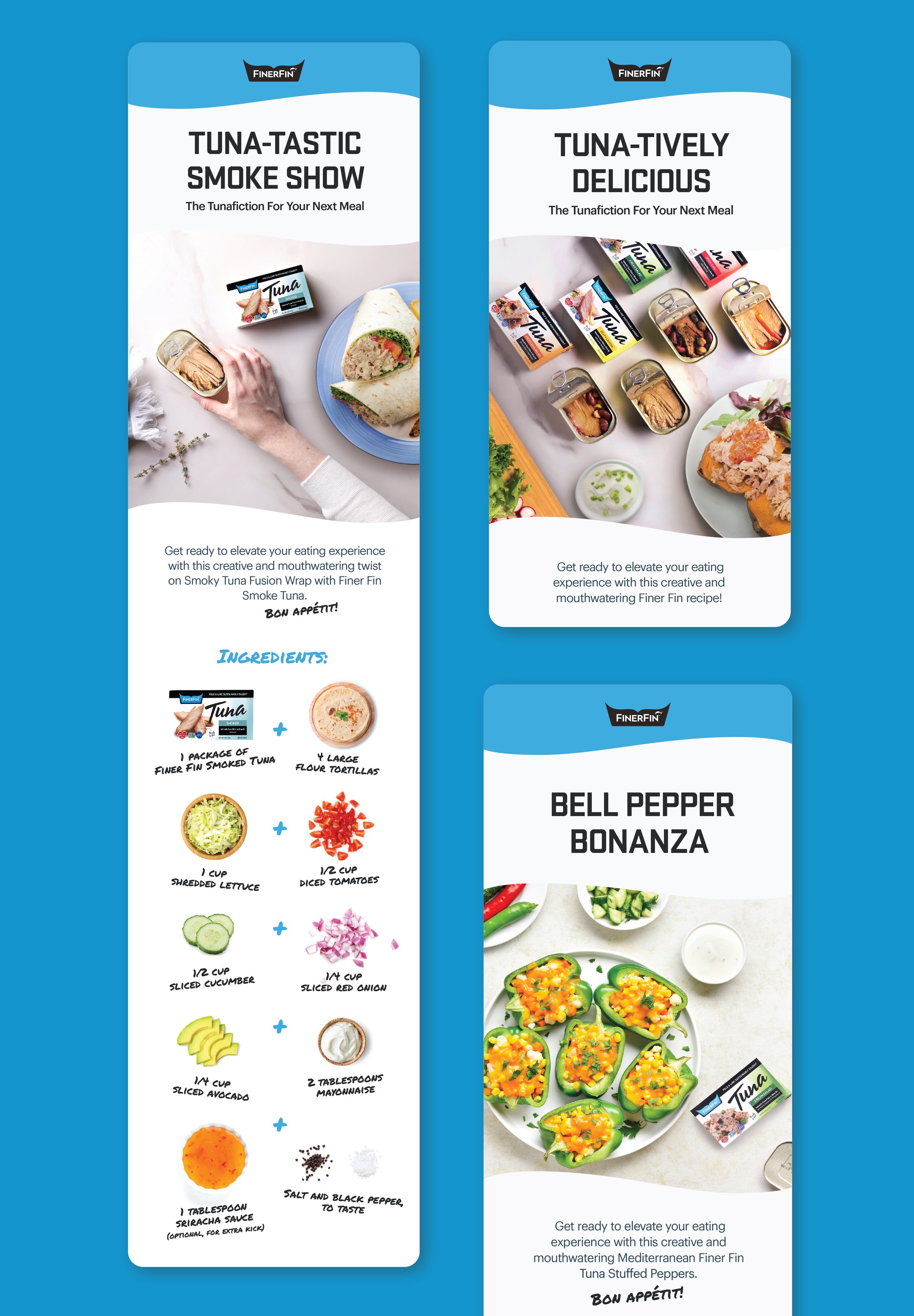 We designed an email marketing campaign for Finer Fin, featuring monthly recipes that showcase the versatility of their products. The design aimed to attract and educate customers, encouraging culinary experimentation.